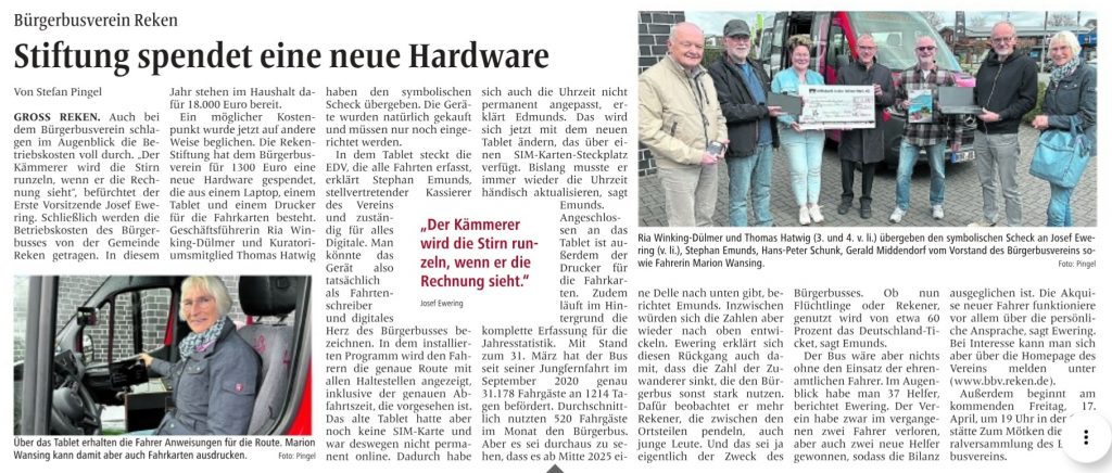 Spende der Reken Stiftung ermöglicht neue Hardware für das Fahrerassistenzsystem im Rekener BürgerBus